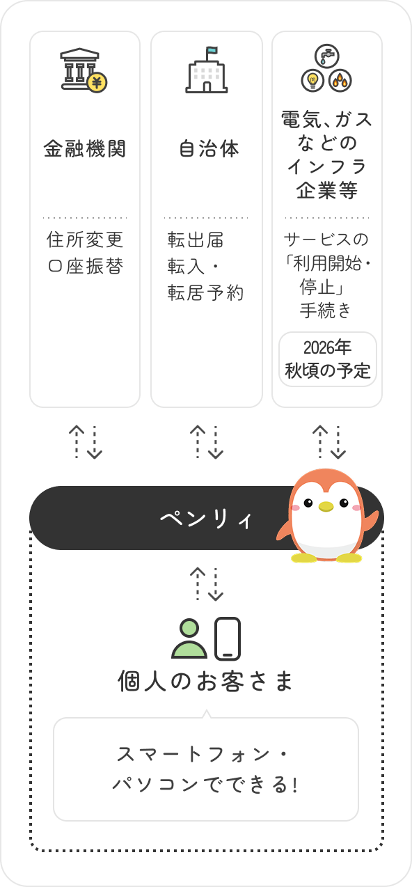 全国の自治体への「転出届/転入・転居予約」、 金融機関への「住所等変更」、「口座振替」をまとめて オンラインで手続きできるサービス