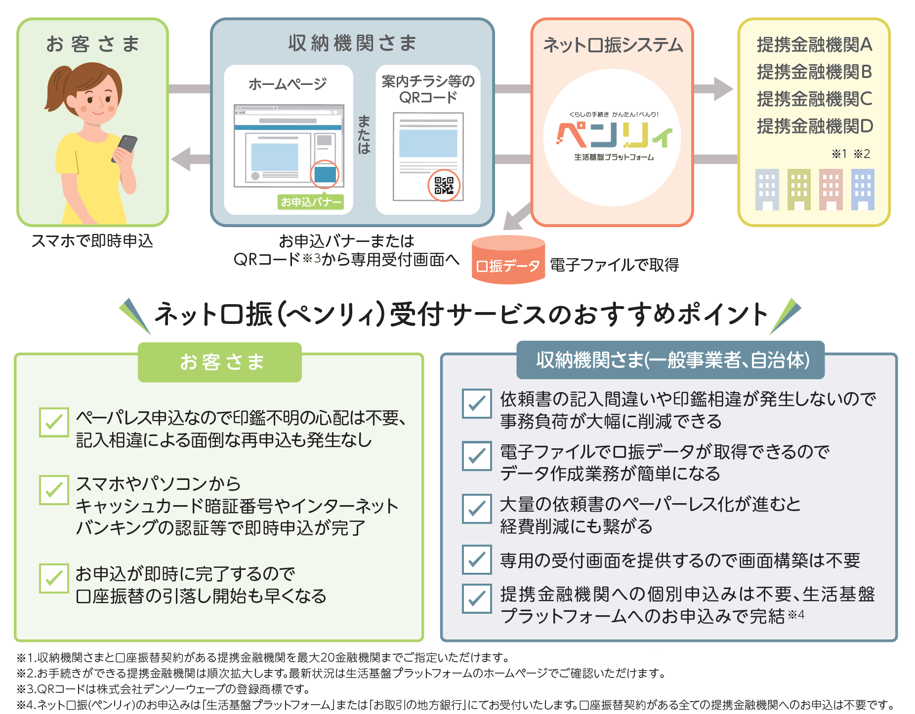従来の紙による口座振替依頼書の受付においては、利用者の記入間違いや印鑑相違による対応、依頼書作成のコスト等が収納機関の課題となっていました。ネット口座振替(ペンリィ)受付サービスは、スマートフォンやパソコンから口座振替を受け付けることで、こうした受付事務の負担をまとめて解消します。また、本サービスでは、株式会社生活基盤プラットフォームに参加する様々な業態の金融機関に対して引落口座の設定が可能であり(サービス開始当初は69金融機関(注)で設定が可能)、利用者向けの口座振替の専用受付画面も当サービス内で提供されるため、地域の収納機関にとっても、低コストで手間なく導入することが可能です。